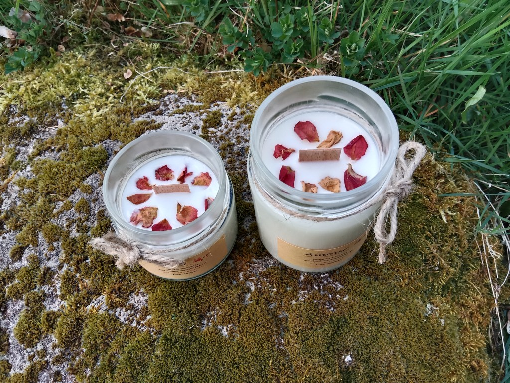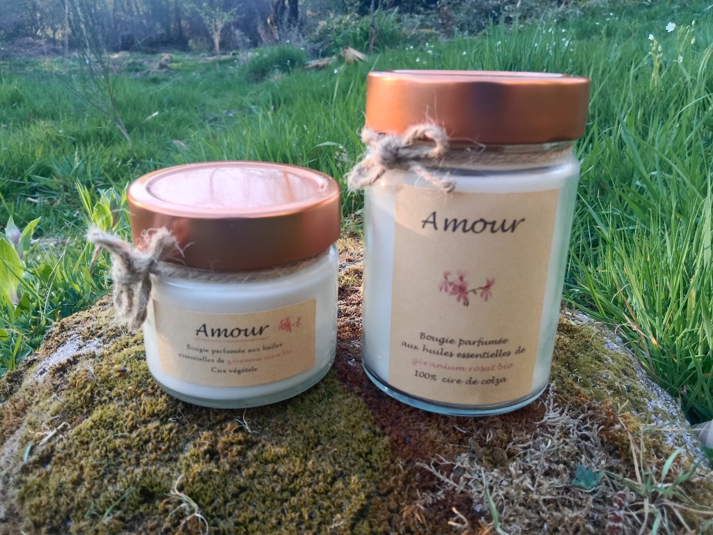 Bougie vibratoire Amour : 100% cire de colza (certifiée ECOCERT), parfumée aux huiles essentielles de géranium rosat bio, quelques pétales de rose et une mèche en bois de hêtre.